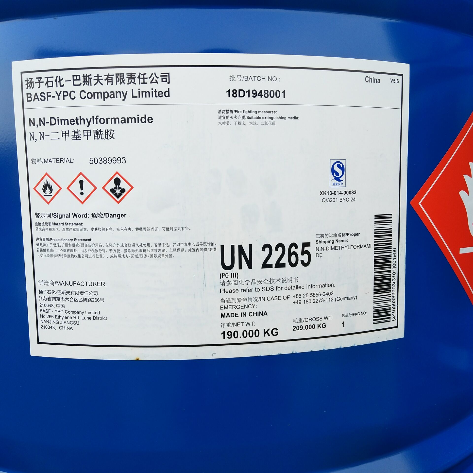 產(chǎn)品名 | N,N-二甲基甲酰胺 | 英文名 | N,N-Dimethylformamide(DMF) | 產(chǎn)品外觀 | 無色透明液體 | 包裝規(guī)格 | 190kg/桶(鐵桶) | 產(chǎn)地 | 江蘇南京 | 供應(yīng)商 | 揚(yáng)子巴斯夫 | 應(yīng)用 | 用作分析試劑和乙烯樹脂、乙炔的溶劑等 | 危險(xiǎn)類別 | 3類危化品 | CAS NO | 68-12-2 |